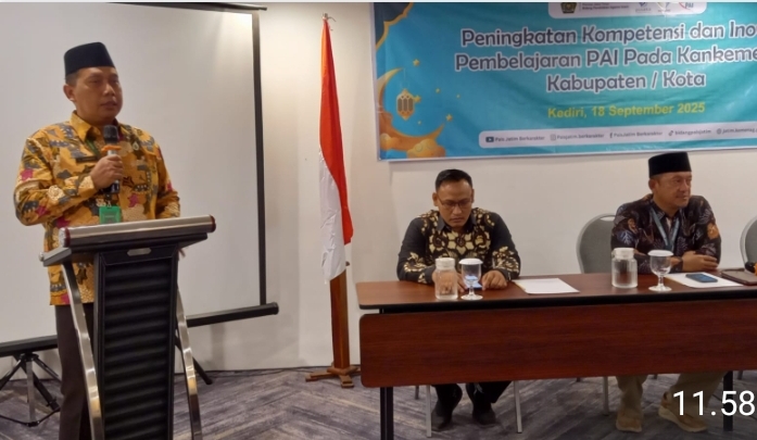 Kepala Kantor Kementerian Agama (Kemenag) Kota Kediri, A. Zamroni, secara resmi membuka kegiatan Peningkatan Kompetensi dan Inovasi Pembelajaran bagi guru Pendidikan Agama Islam (PAI) se-Kota Kediri, Kamis (18/9/2025) pagi di Hotel Five Kediri,