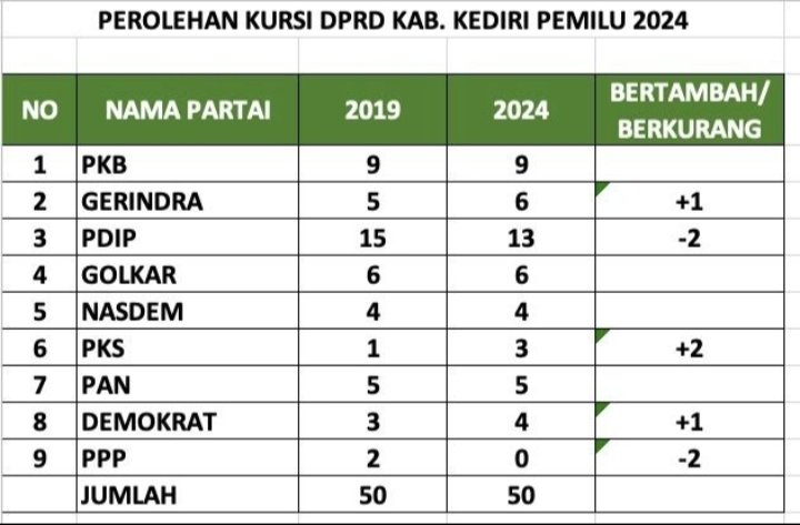 Dalam.perhelatan lima tahunan yakni Pemilu Legislative (Pileg) tahun 2024 untuk tingkat Kabupaten Kediri PDI Perjuangan kehilangan 2 kursi, sedangkan Partai NasDem aman bertahan 4 kursi. Namun PPP yang semula memiliki 2 kursi, untuk Pileg 2024 tahun ini malah hilang.