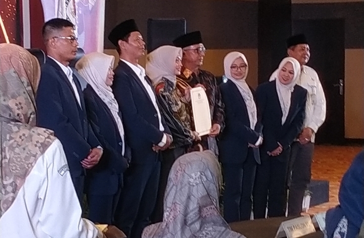 Walikota dan Wakil Walikota terpilih Kota Kediri,  Vinanda Prameswati dan Gus Qowimudin saat serah terima berita acara penetapan pemenang Pilwali Kota Kediri 2024 dari KPU Kota Kediri.(foto:aji_pledoi.co)