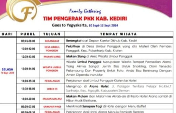 Bupati Kediri Hanindhito Himawan Pramana mengajak para pejabat Pemkab dan Camat spe-kabupaten Kediri diajak pelesir yang dibungkus dengan rapat kerja (Raker) ke Yogyakarta mulai Rabu (11-14/9/2025)