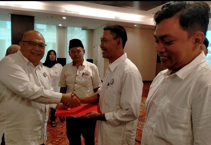 Ketum DPP Gerbang Semut Abrit H.Erjik Biantoro, SH.MH saat menyerahkan SK kepengurusan kepada ketua PAC. (foto:aji_pledoi.co)