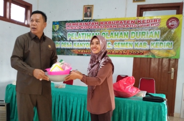 Sekitar 30 orang emak emak warga Desa Kanyoran Kecamatan Semen Kabupaten Kediri mendapat pelatihan membuat kue dengan berbahan baku durian dan pongge (biji durian), di balai desa setempat Senin (14/11/2022)