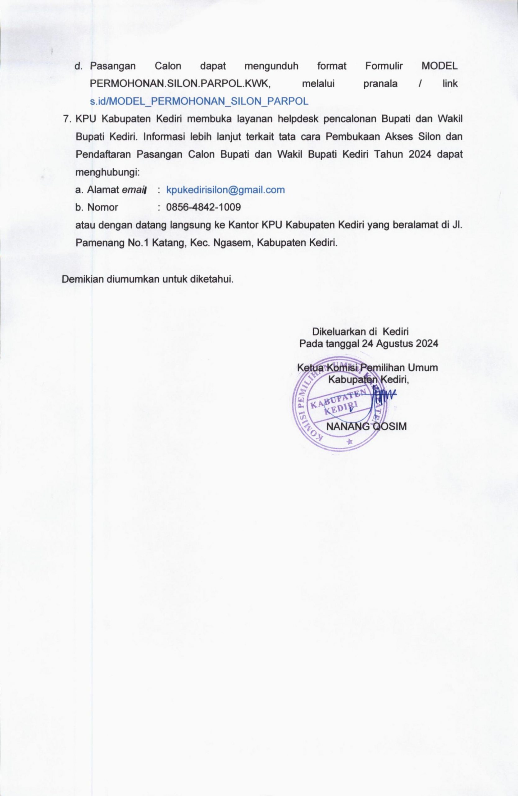 Menyikapi Putusan Mahkamah Konstitusi, KPU Kabupaten Kediri Mengumumkan Syarat Pendaftaran Calon Bupati dan Wakil Bupati Kediri 2024 2024-08-252024-08-25by admin-1398 Viewsby admin Post Views: 1,398 Don't MissDiduga Pungli PTSL, Kepala Desa Keling Didemo LSM SrikandiKetepatan Waktu KA Daop 7 Madiun Lampaui Target, Penumpang Nataru 2025/2026 Naik 8 PersenDandim 0809/Kediri Resmi Dijabat Letkol Dhavid Nur Hardiansyah, Siap Kawal Proyek Strategis NasionalPerangkat Desa Tasikmadu Rangkap Jabatan di Gapoktanhut, Pelayanan Publik TergangguTiket KA Nataru dari Daop 7 Madiun Masih Tersedia, KAI Imbau Masyarakat Segera Pesan Tiket