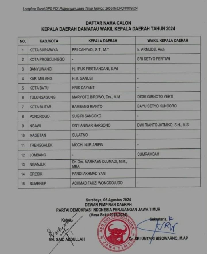 Bahkan, dugaan itu diperkuat dengan terbitnya surat DPD PDI Perjuangan Jawat Timur No.2656/IN/DPD/VIII/2024 telah tercatat 15 nama calon kepala daerah dan wakil kepala daerah Kabupaten dan kota se Jawa Timur. Dalam daftar nama nama yang tercantum yang telah di Rekom oleh PDIP, yang ditanda Tangani Ketua DPD PDIP Jatim MH.Said Abdullah pada 6 Agustus 2024 itu, juga tidak ada nama Hanindhito Himawan Pramana.