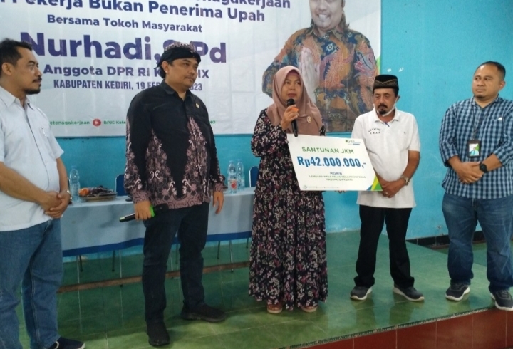 Anggota Komisi IX DPR RI dari Fraksi Nasdem Nurhadi, SPd bersama BPJAMSOSTEK Sosialisasikan program BPJS Ketenagakerjaan bagi pekerja bukan penerima upah alias pekerja mandiri, di Gedung Serba Guna Desa Pelas Kecamatan Kras Kabupaten Kediri, Minggu (19/2/2023)